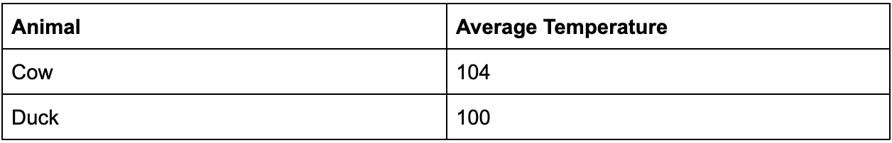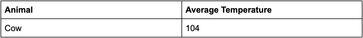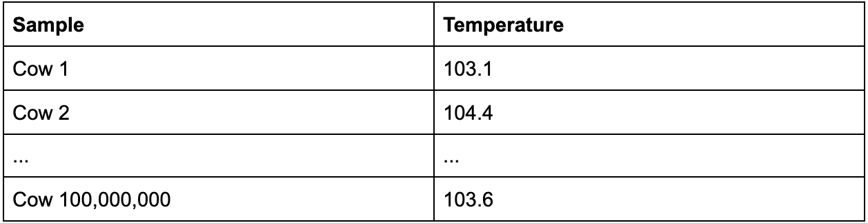 This data table could be used to answer the question “what is the average temperature of a cow”, without needing to trust Google. The reason big data has become so popular is because often you can make more trustworthy conclusions if you have more data.
